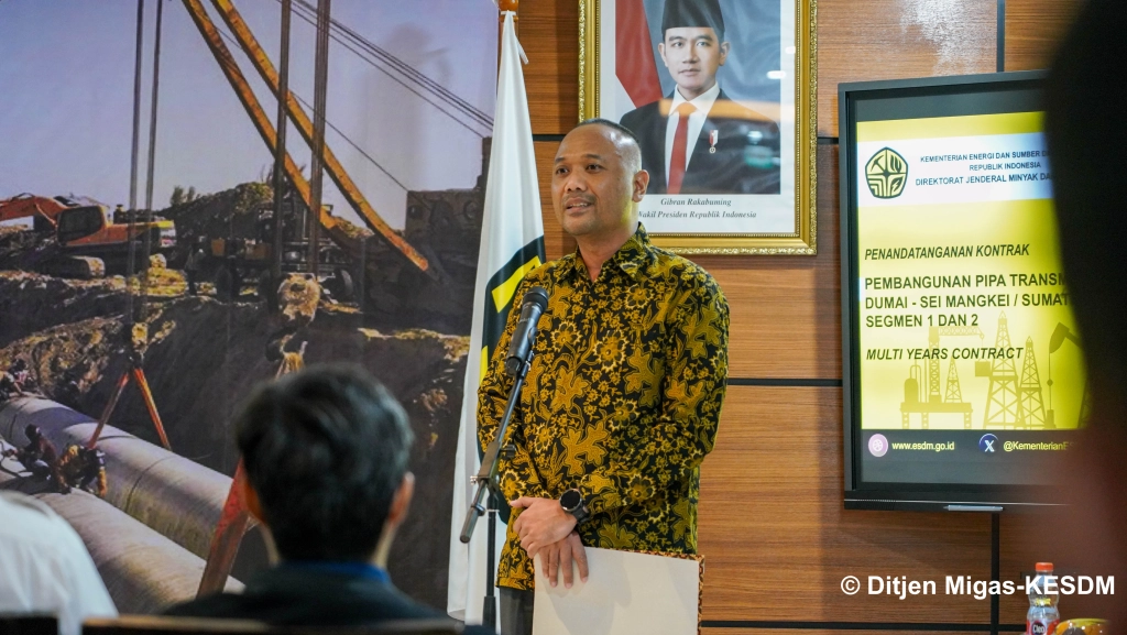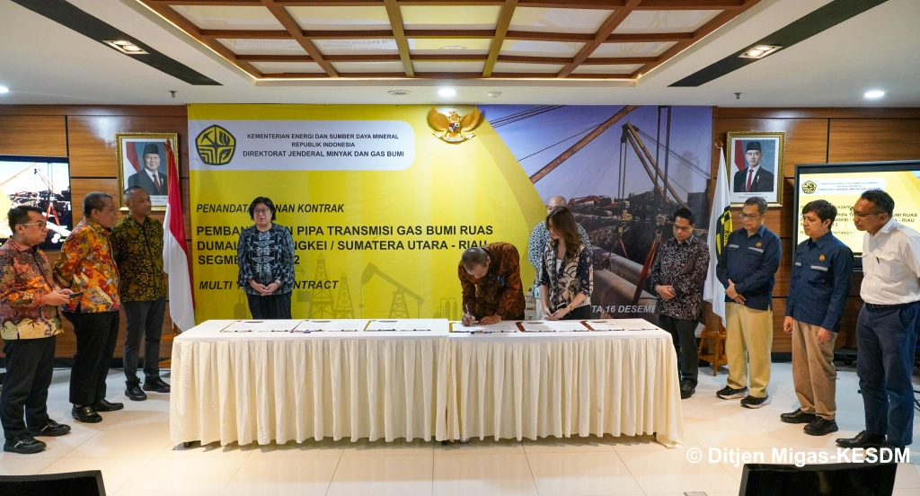 Jakarta, Pemerintah terus mendorong program diversifikasi energi dan percepatan pemanfaatan gas bumi domestik guna mendukung ketahanan energi nasional. Sejalan dengan hal tersebut, Direktorat Jenderal Minyak dan Gas Bumi (Ditjen Migas) Kementerian Energi dan Sumber Daya Mineral (ESDM) resmi menandatangani kontrak paket pekerjaan Engineering, Procurement, and Construction (EPC) pembangunan proyek strategis nasional Pipa Transmisi Gas Bumi Ruas Dumai – Sei Mangkei (Dusem) di Kantor Ditjen Migas, Gedung Ibnu Soetowo Jakarta, Selasa (16/12).
