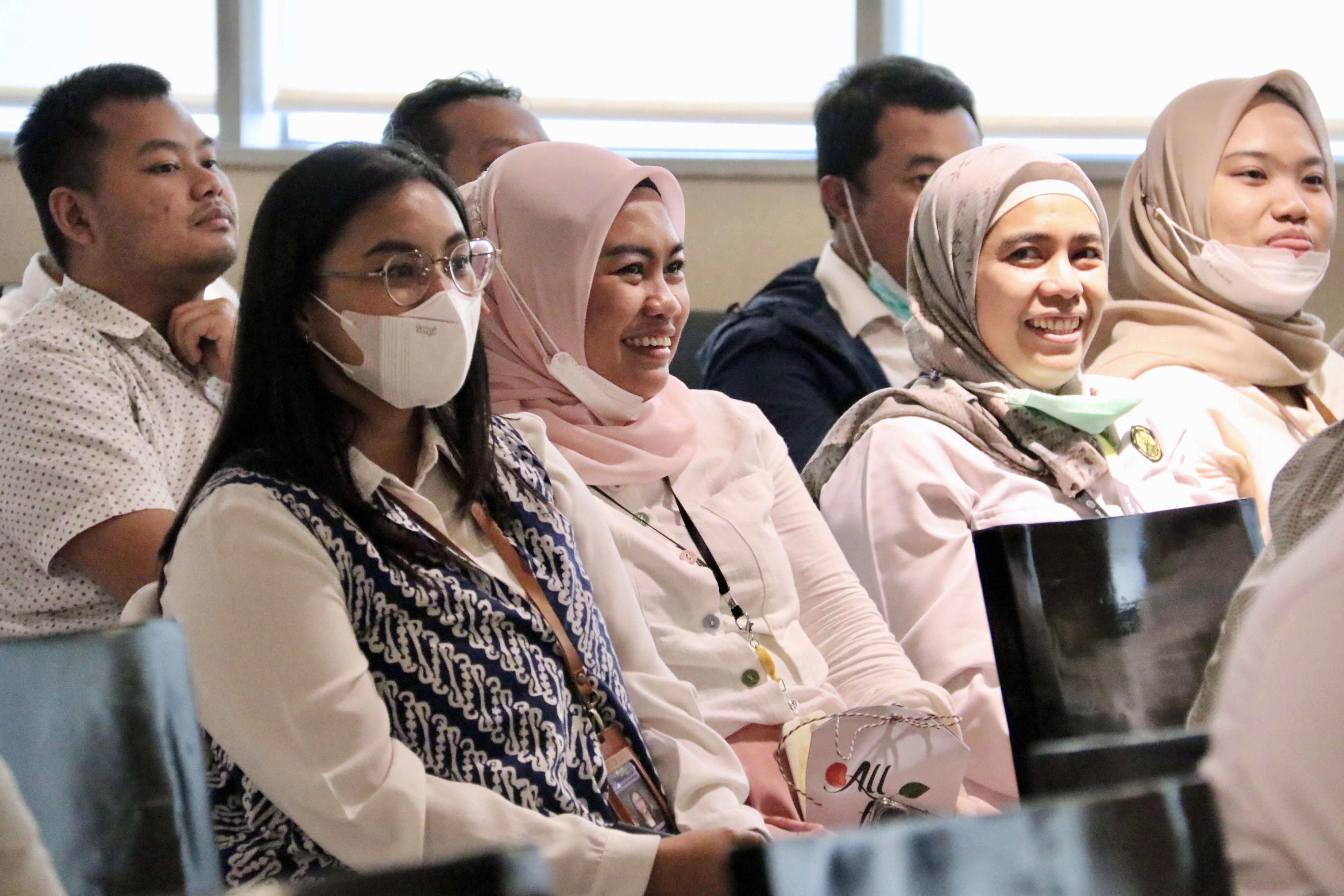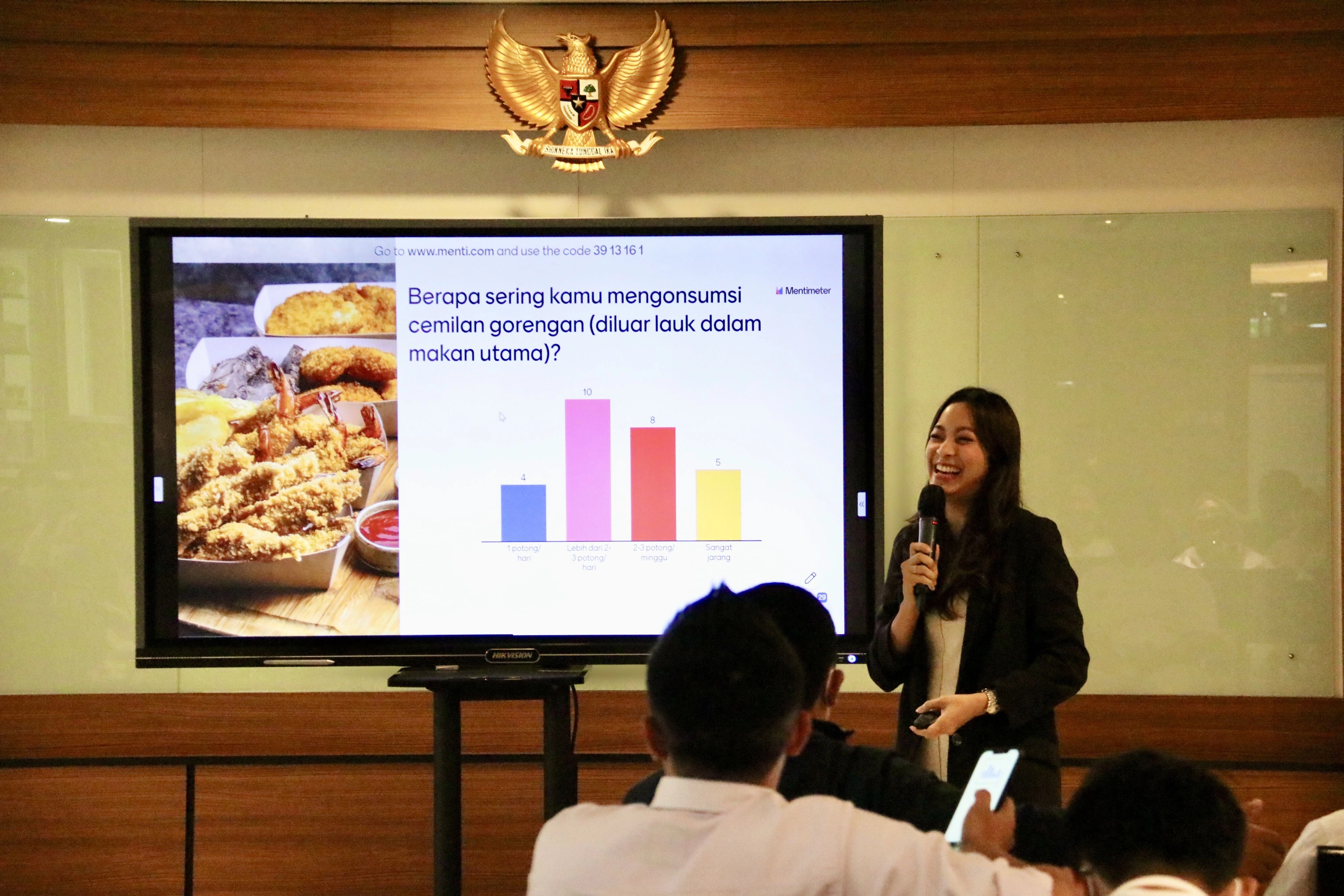 Tri Mutiara Ramdani menjelaskan bahwa makan sehat di kantor disertai dengan aktif bergerak dapat memberikan banyak hal positif seperti hasil MCU bagus, risiko penyakit berkurang, suasana hati dan energi baik, produktivitas terjaga, mengurangi stres, meningkatkan daya tahan tubuh, sekaligus dapat menjadi latihan manajemen waktu serta mewujudkan work-life balance. “Lalu makan sehat itu terdiri dari apa saja? Makan sehat adalah makan dengan komposisi seimbang, bahan makanan bervariasi dan porsi sesuai kebutuhan masing-masing. Tentungan dengan tetap mengkonsumsi asupan gula, garam & lemak tambahan sesuai anjuran,” paparnya.